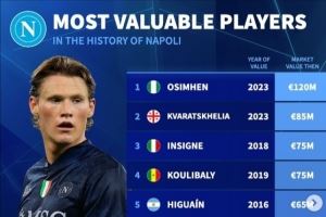 体育资讯10月28日讯 德国转会市场统计了那不勒斯队史的身价前10球员,奥斯梅恩位列第一。